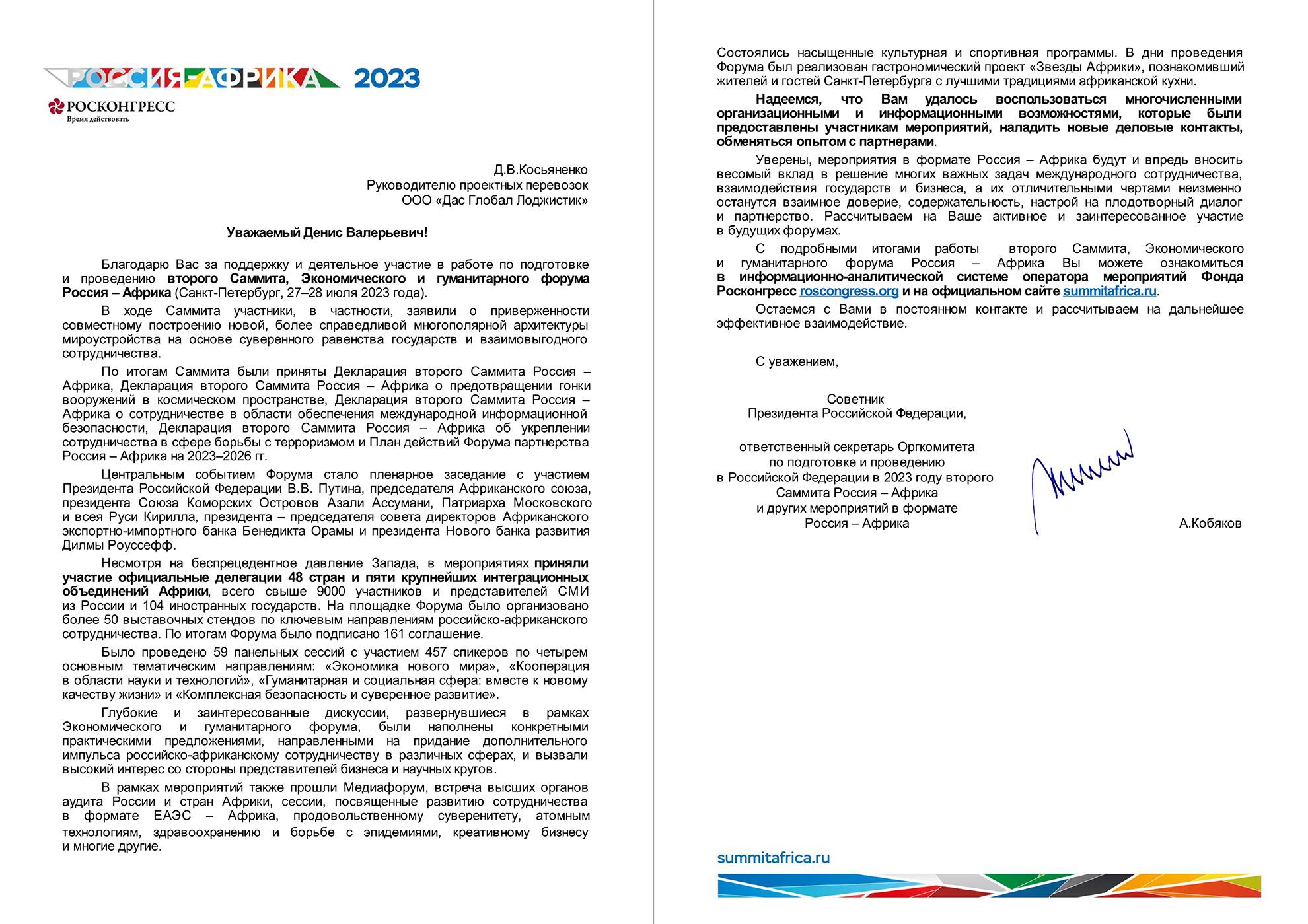 ДАС ГЛОБАЛ ЛОДЖИСТИК получила благодарственное письмо от Фонда Росконгресс в рамках участия во втором международном Саммите, Экономического и гуманитарного форума Россия – Африка.