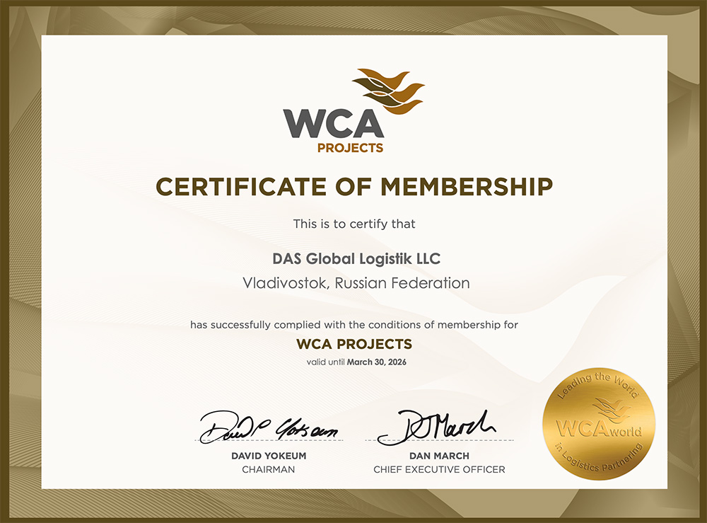 - Сертификат WCA PROJECTS, подтверждающий членство в международной ассоциации WCA PROJECTS по проектным грузам на 2025 г.