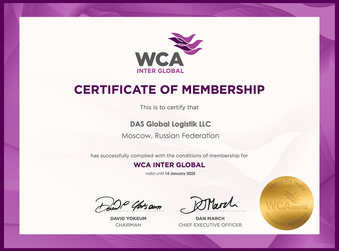 - Сертификат WCA INTER GLOBAL, подтверждающий членство в международной ассоциации WCA INTER GLOBAL по перевозке генеральных грузов на 2025-2026 гг.